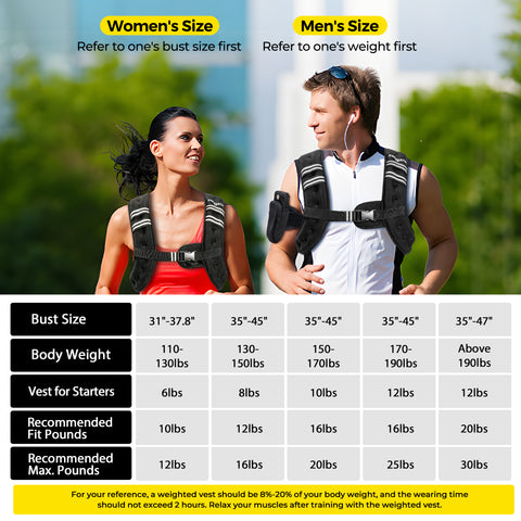 - HELPFUL TIPS: If you’re new to weighted vests, start with the recommended weight on our size chart and gradually increase intensity. For the perfect fit, choose your vest based on chest measurement and body weight. Get one for yourself now and let gravity maximize your exercise.